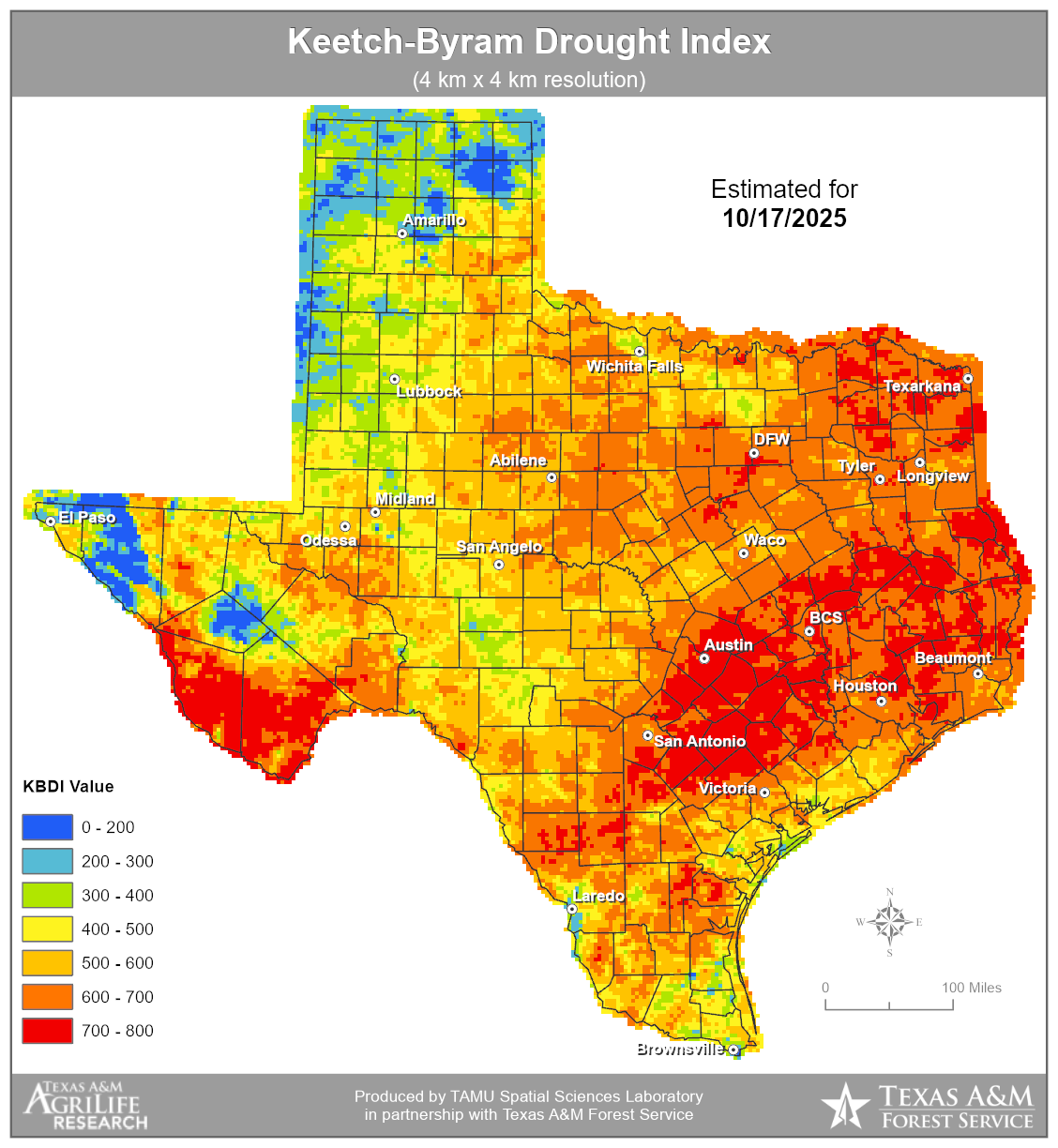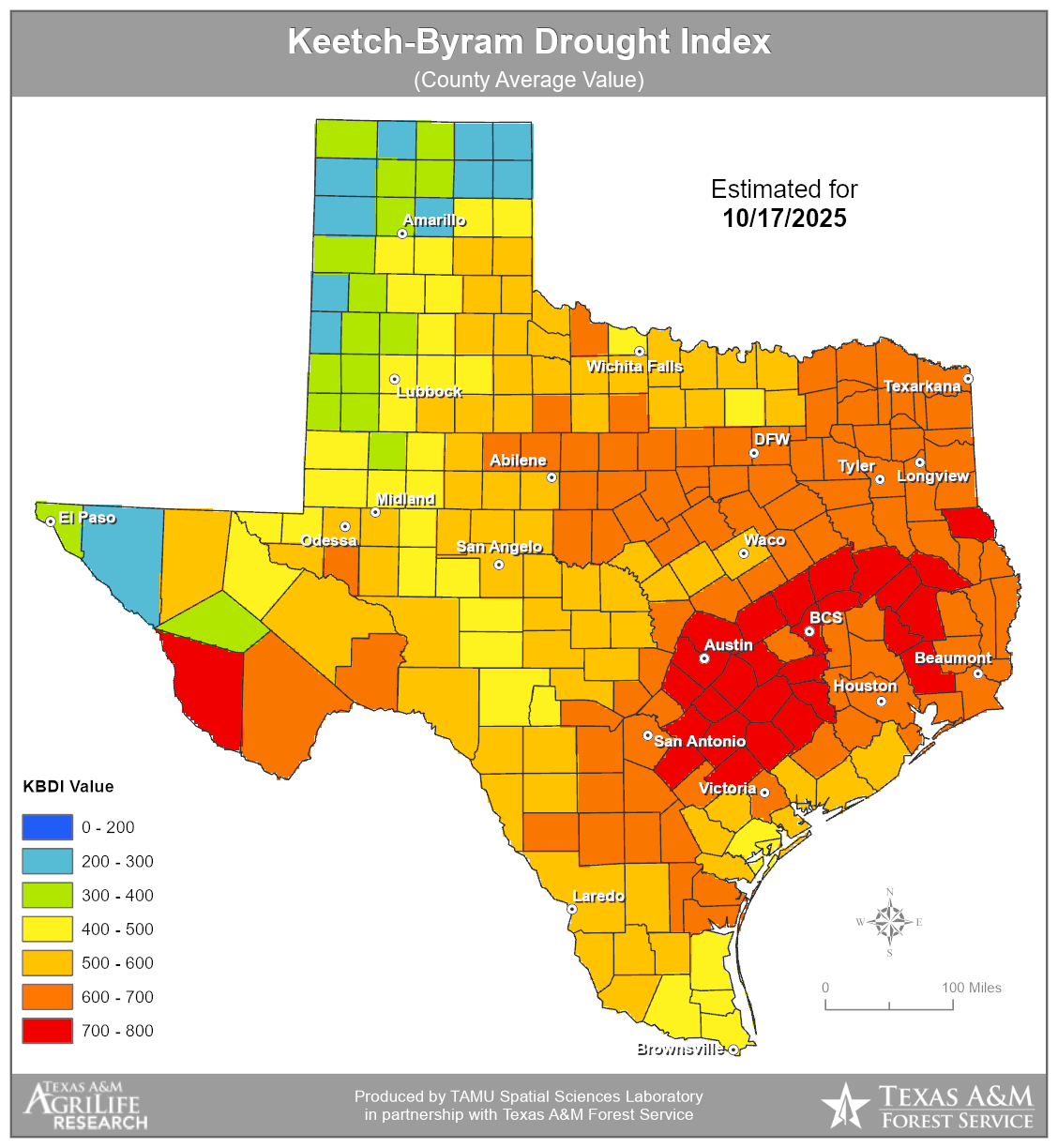 The drought index ranges from 0 to 800, where a drought index of 0 represents no moisture depletion, and an index of 800 represents absolutely dry conditions. Presently, this index is derived from ground based estimates of temperature and precipitation derived from weather stations and interpolated manually by experts at Texas A&M Forest Service (TAMFS) for counties across the state. Researchers at Texas A&M University are working with TAMFS to derive this index from AVHRR satellite data and NEXRAD radar rainfall within a GIS.