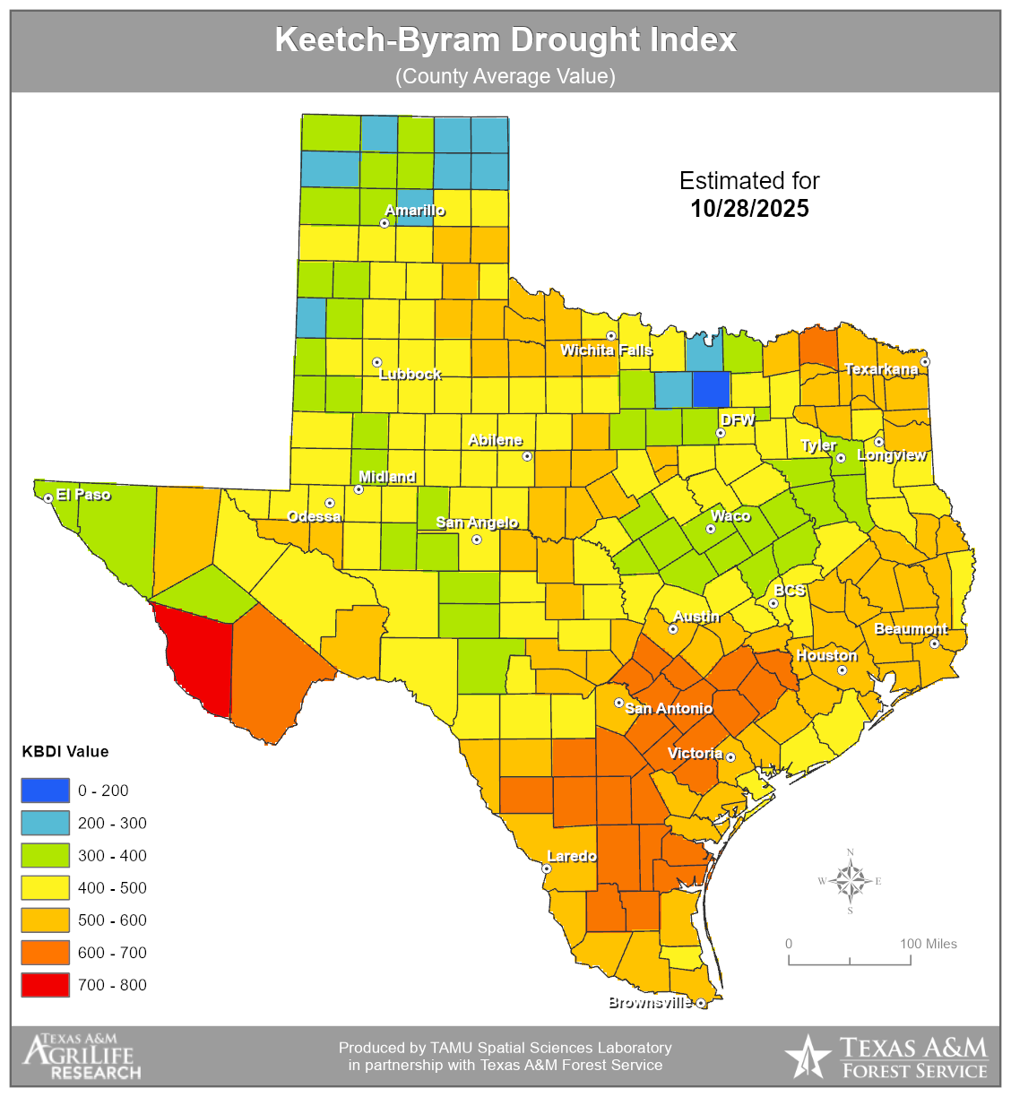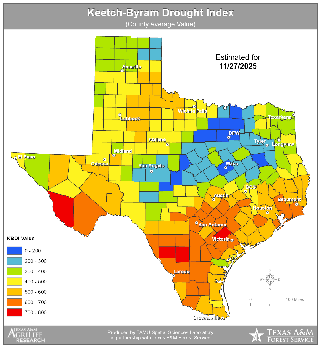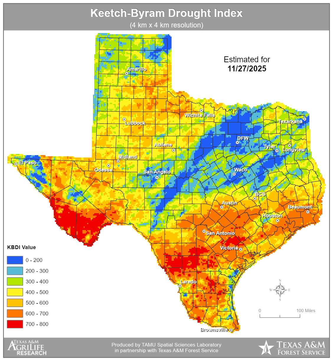 Keetch-Byram Drought Index (KBDI) is an index used to determining forest fire potential. The drought index is based on a daily water balance, where a drought factor is balanced with precipitation and soil moisture (assumed to have a maximum storage capacity of 8-inches) and is expressed in hundredths of an inch of soil moisture depletion.